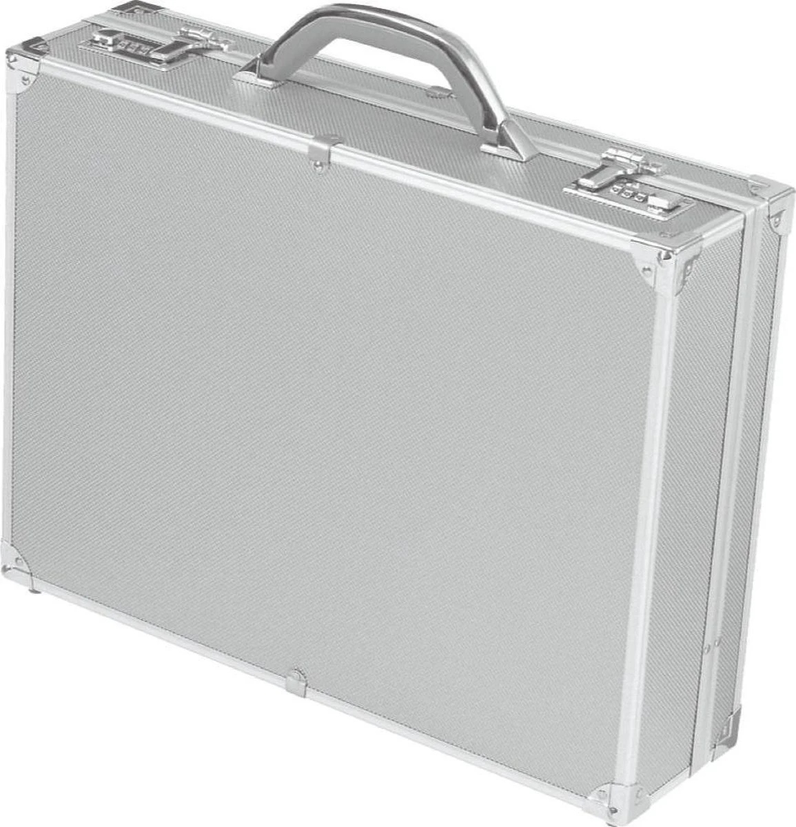 Attaché case, met 2 cijfersloten. Binnenafwerking: uitneembaar compartiment met 2 opbergvakken A4, 3 pennenhouders en visitekaart vak.
