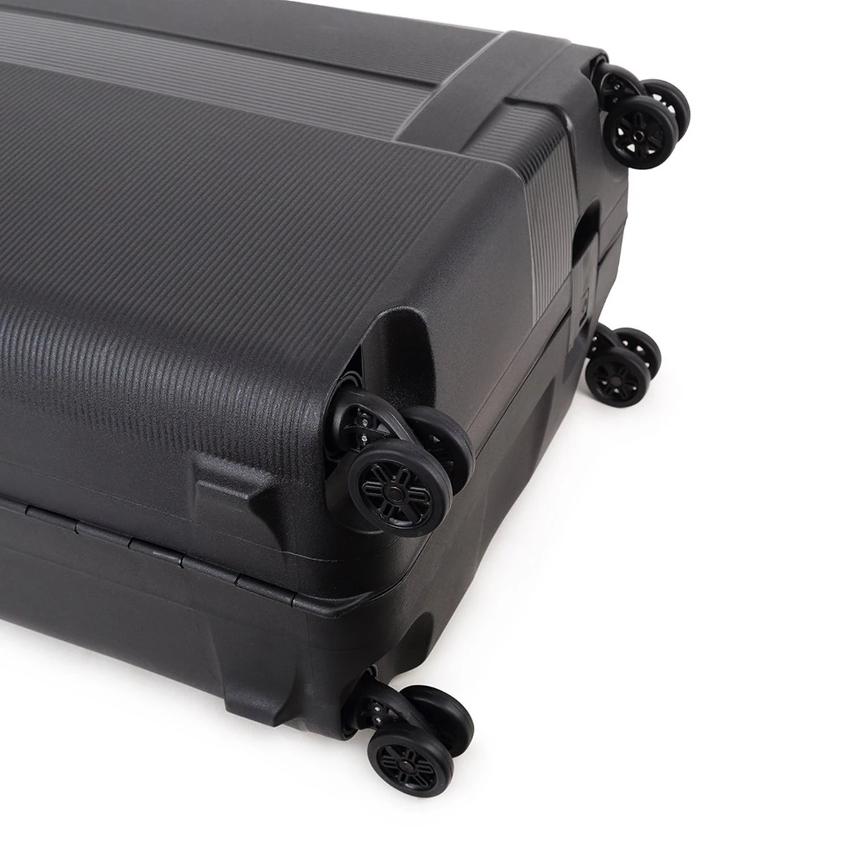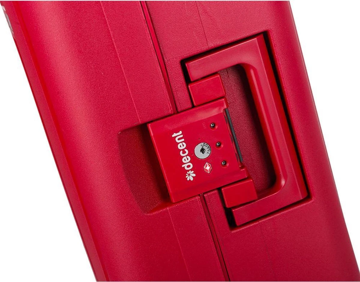 Middelgrote polypropyleen hardschalen koffer uit de Transit serie van het merk Decent. De koffer is rondom voorzien van drie kliksloten. Op de boven-en onderkant zitten sloten die u vastklikt en op de zijkant zit het hoofdslot dat een TSA cijferslot is. De koffer heeft een zwarte voering, een tussenschot met rits, een extra ritsvak en is voorzien van spanbanden. Handvat op bovenkant en zijkant en voorzien van een comfortabel dubbel 4-wiel systeem.