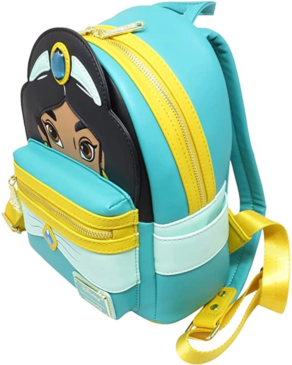 Rugtas Aladdin Jasmine Cosplay. Prachtige kunstlederen tas uit de Disney-collectie van het Amerikaanse designermerk Loungefly. De tas heeft het uiterlijk van de beeldschone oosterse prinses Jasmine uit Disney’s Aladdin. Het voorvakje is voorzien van een ritssluiting. De tas is verder voorzien van twee verstelbare schouderbanden en een bijpassende binnenvoering.