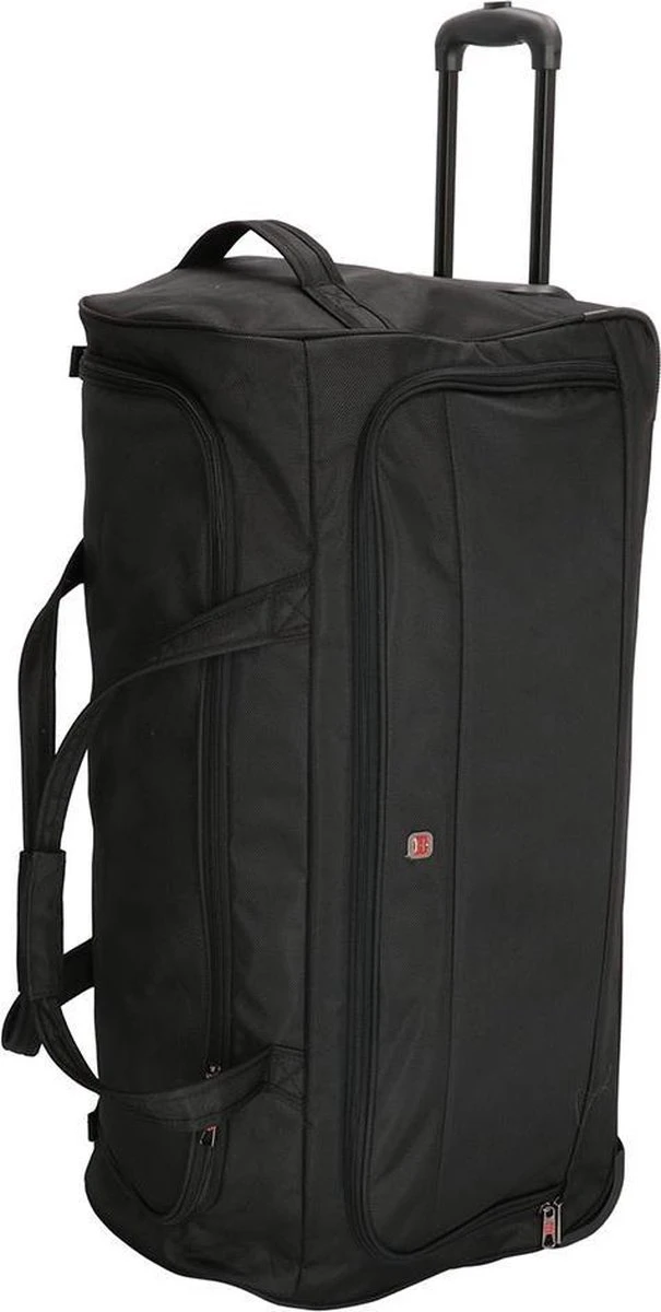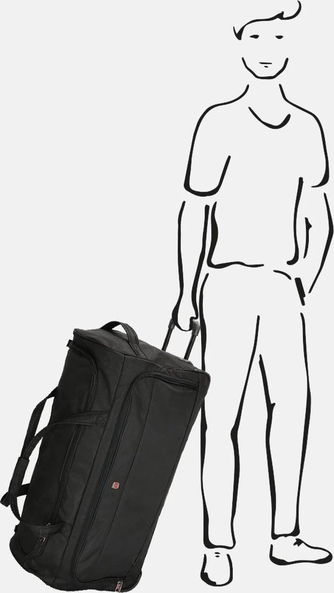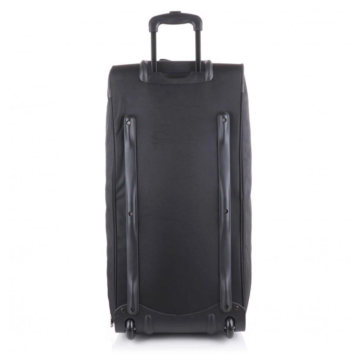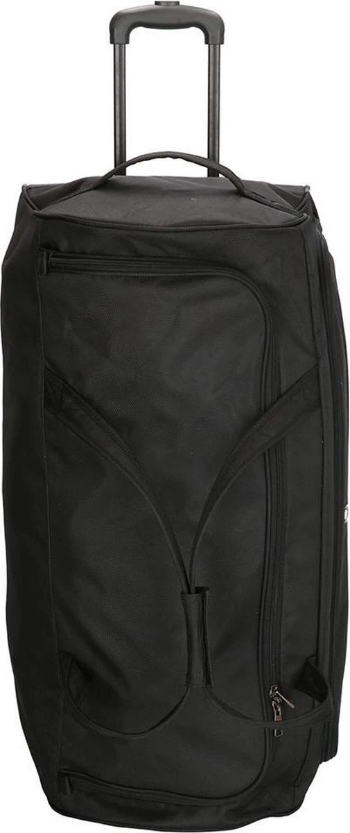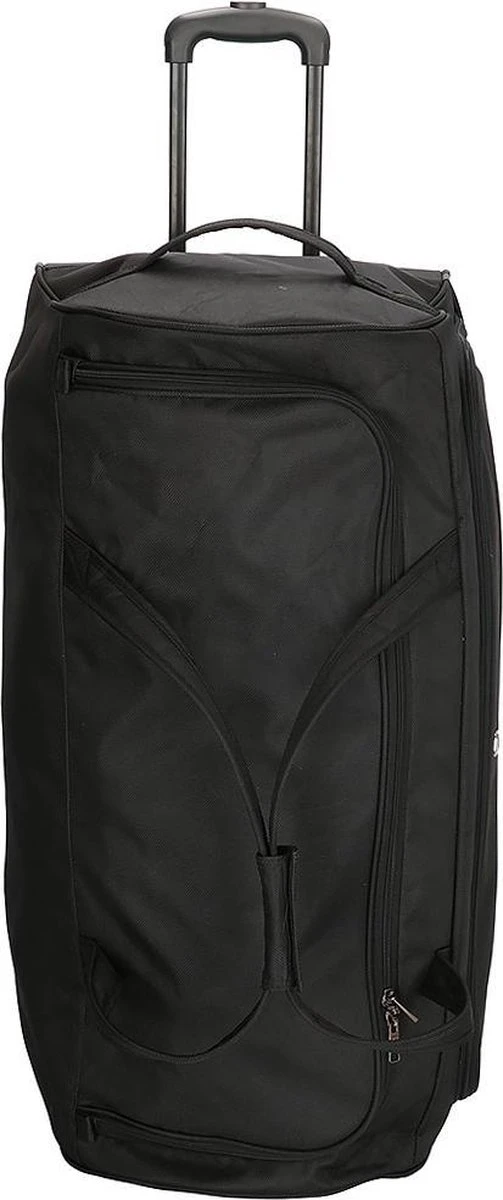 Grote wieltas uit de Adelaide serie van Enrico Benetti in kleur zwart met aan de buitenzijde een ritsvak over de hele breedte van de tas. De wieltas heeft een groot hoofdvak met een inhoud van ca. 100 liter dat te openenen is middels U-vormige klep met ritssluiting. Er zit een handvat op bovenkant en de tas heeft ook 2 korte draagbanden die samengebonden kunnen worden met een klittebandsluiting.
