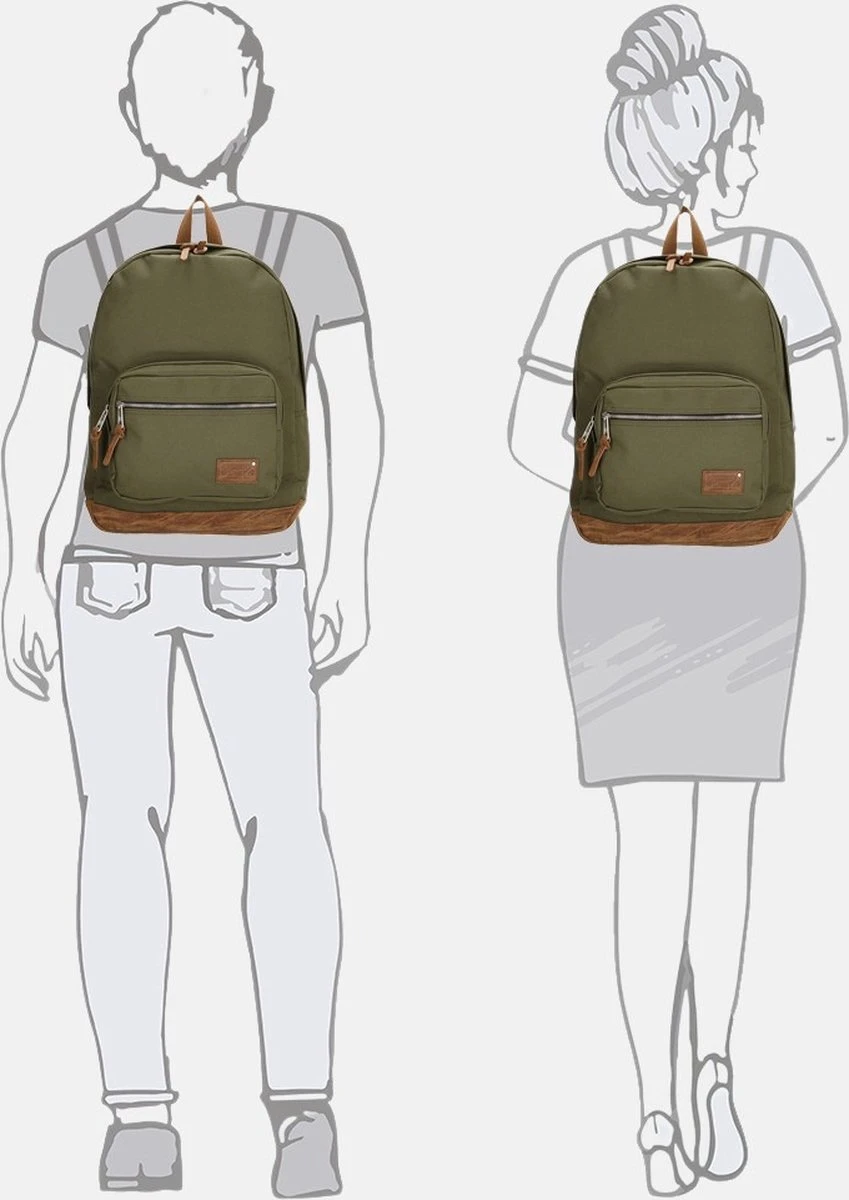 Deze ruime rugtas uit de Santiago serie van Enrico Benetti is dé alleskunner voor naar school, werk of iedere dag. Deze Santiago serie kenmerkt zich door het stevige polyester in basic kleuren, bloemen of camouflage print, gecombineerd met het bruine PU met ruwe uitstraling. Zo krijgen de tassen een stoere outdoor-look! Deze grote rugzak heeft twee voorvakken, een ruim hoofdvak en een achtervak met rits voor je laptop van 15″. De tas is afgewerkt met leuke kunstlederen details, metalen hardware en verstelbare banden van bruin katoen.