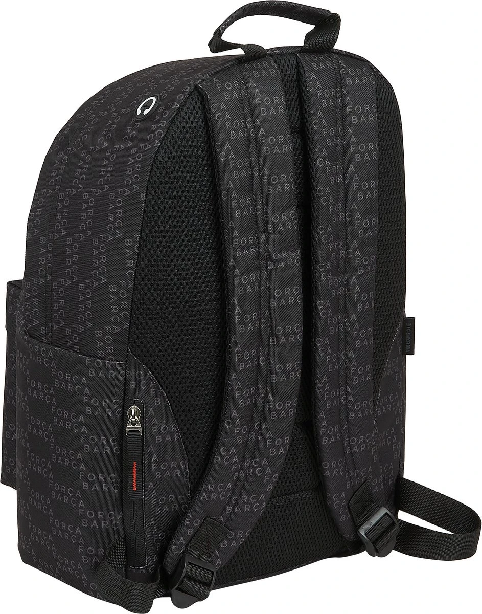 FC Barcelona Laptop Rugzak 14,1″, Forca. Deze stoere laptoptas is een echte musthave voor alle fans van de Spaanse voetbalclub FC Barcelona. Uitgevoerd in een mooi strak zwart design kan je, naast al je schoolspullen, een laptop met een maximale afmeting van 14.1″ kwijt in een apart vak. Verder heeft de tas nog een voorvak met rits en twee open zijvakken. Kortom: een geweldige schooltas en een leuk cadeau-idee voor de liefhebbers van voetbal!