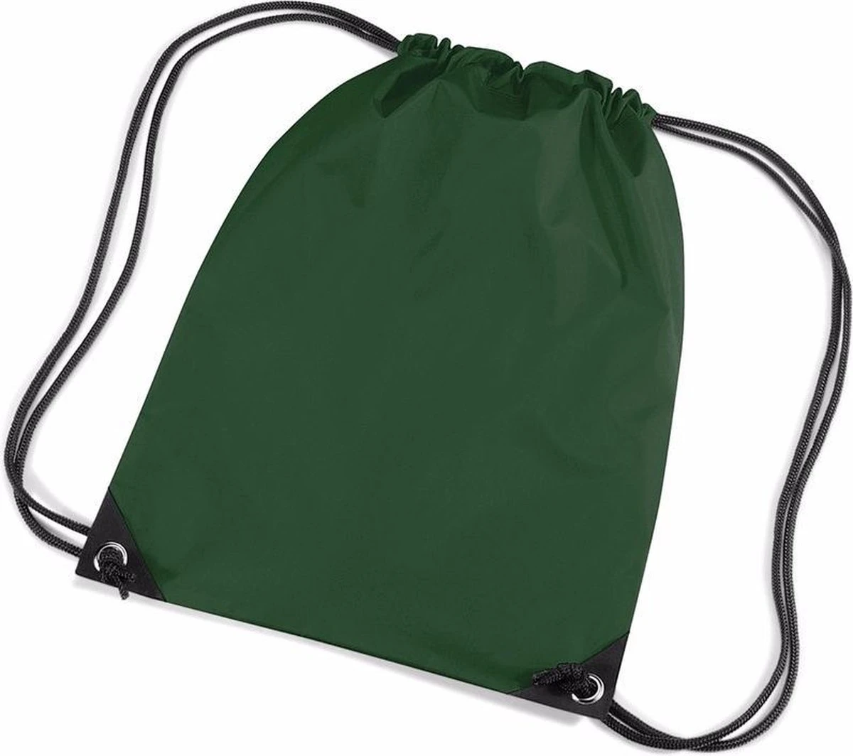 Nylon gymtas in het donkergroen van waterafstotende stof en reigkoord. Inhoud: 12 liter. Afmeting: 45 x 34 cm.