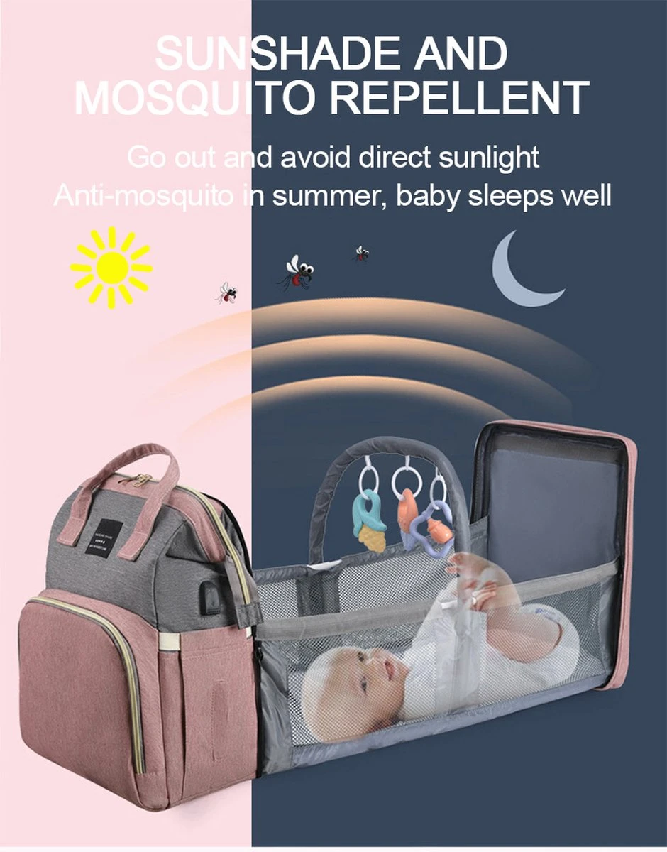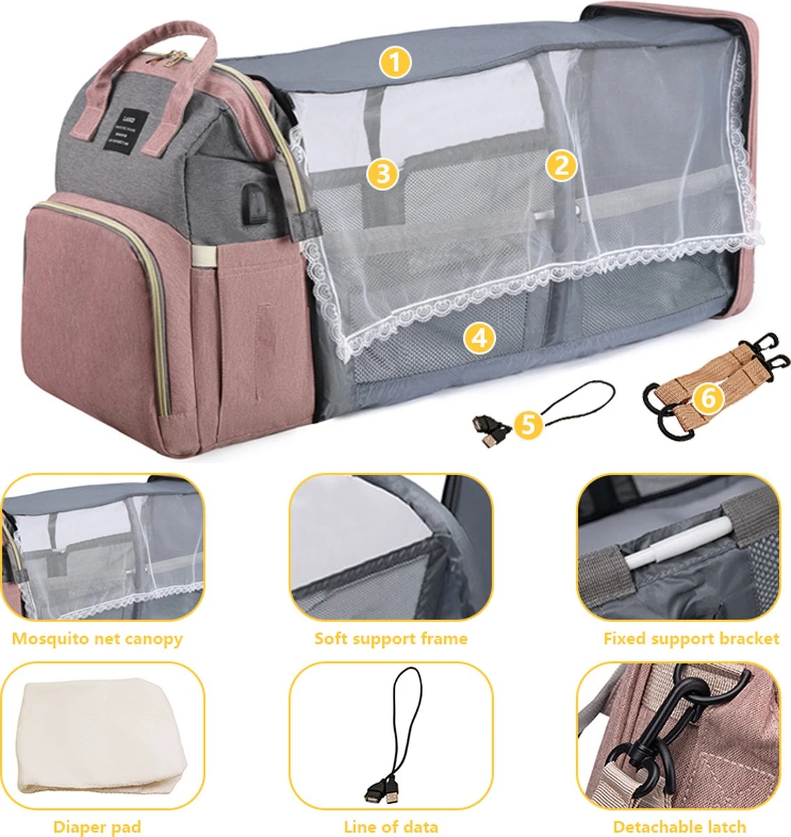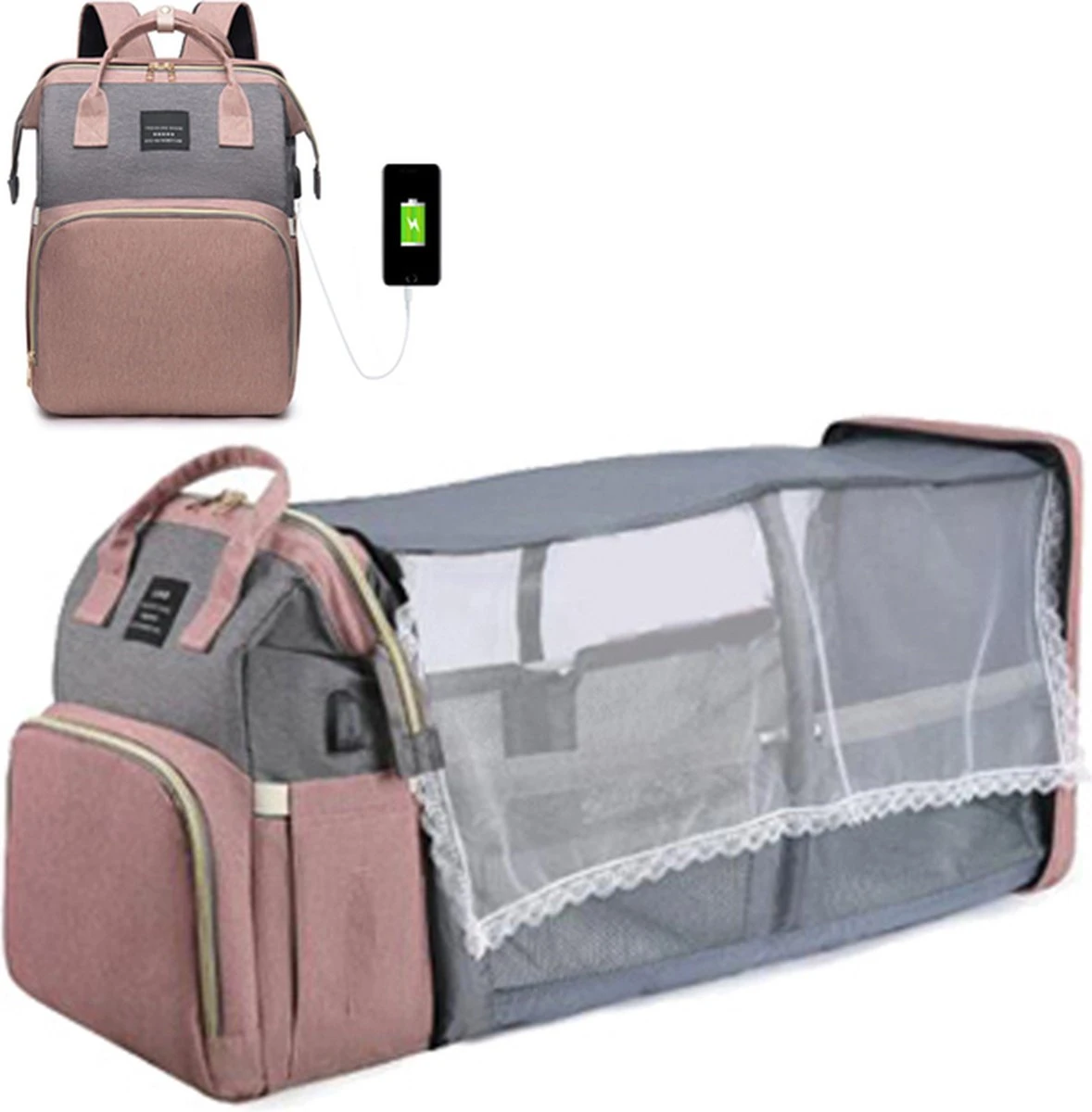 Je kunt de tas uitklappen naar een bedje waarin je het kind elk moment kan verschonen of laten rusten. Er zit een netje/klamoe bij voor de privacy maar ook voor de bescherming.
