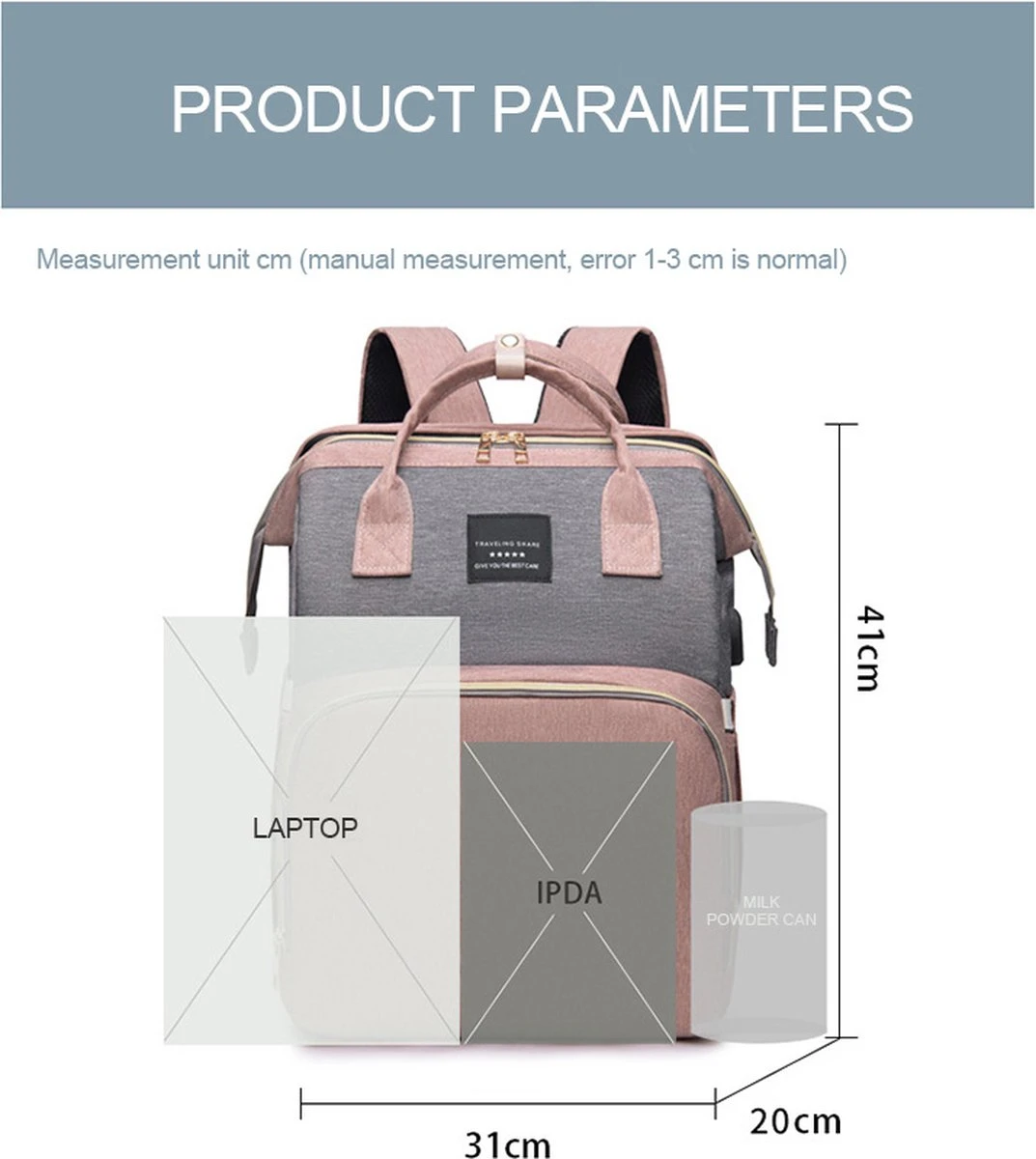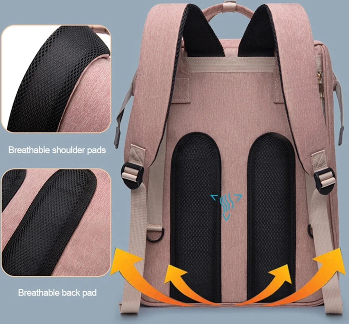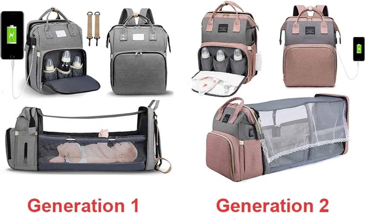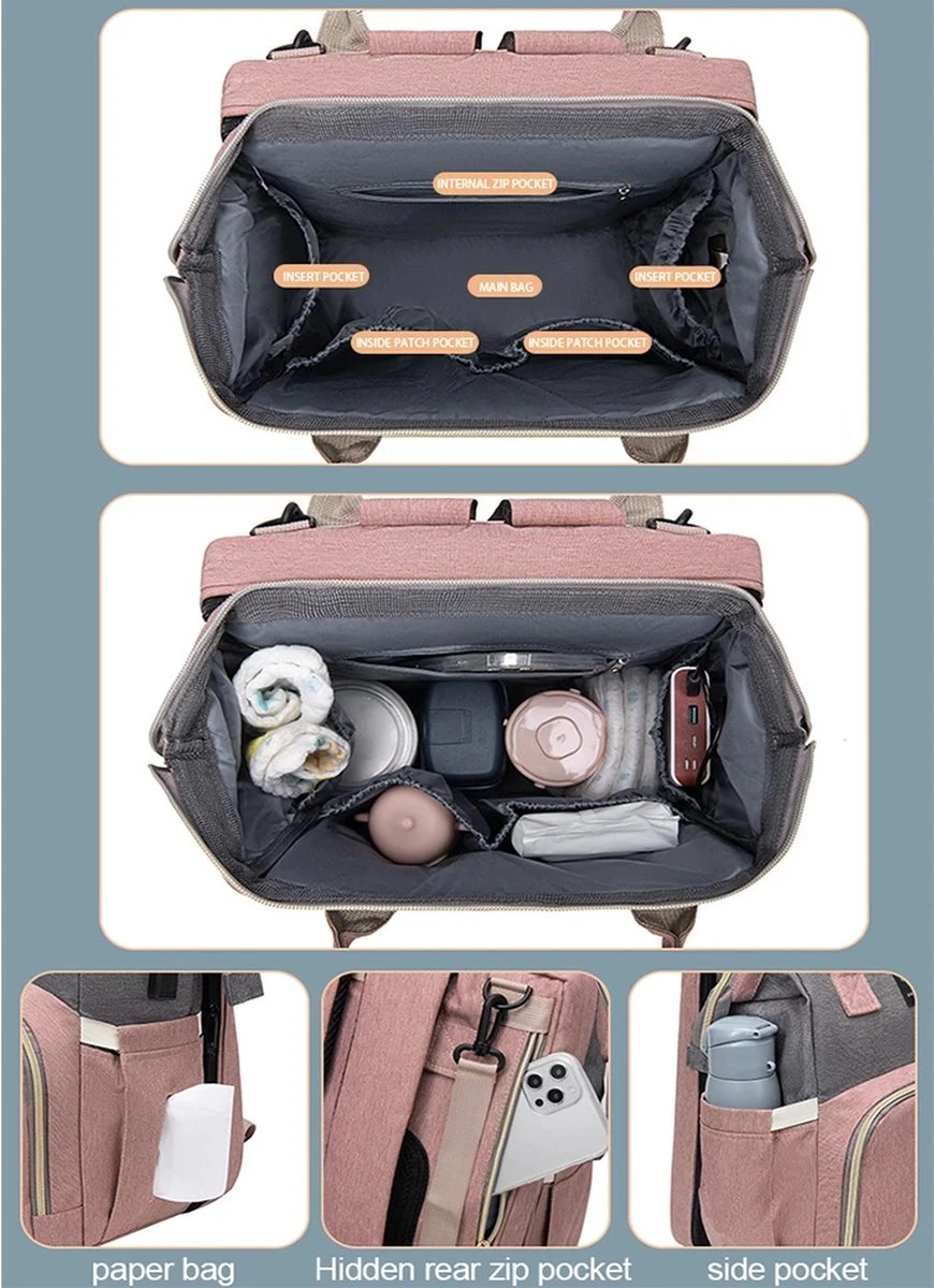 Je kunt de tas uitklappen naar een bedje waarin je het kind elk moment kan verschonen of laten rusten. Er zit een netje/klamoe bij voor de privacy maar ook voor de bescherming.