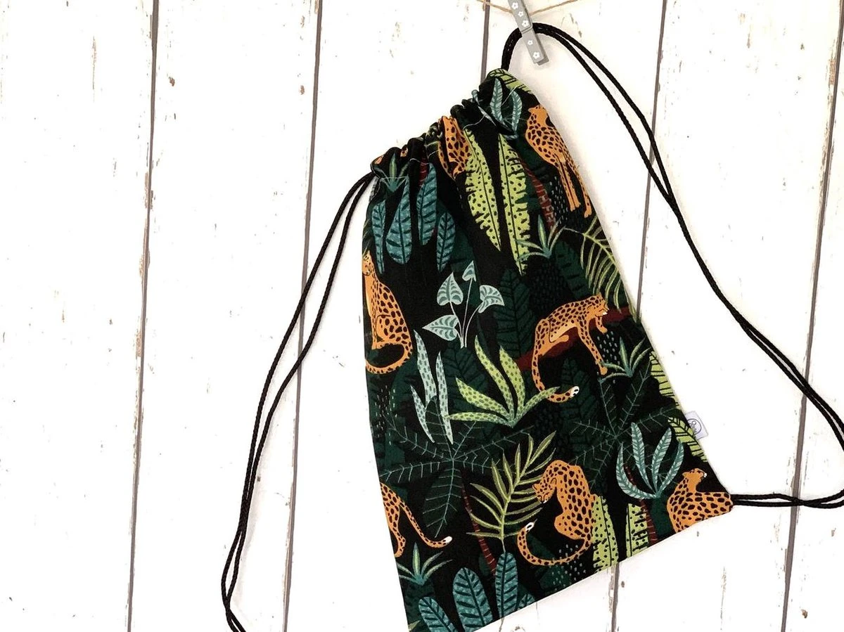 Super leuk zwart rugtasje met luipaarden voor jongens en meiden. Dit tasje met rijgkoord is ideaal om te gebruiken als gymtas of zwemtas.