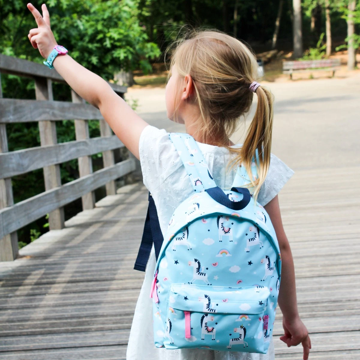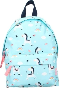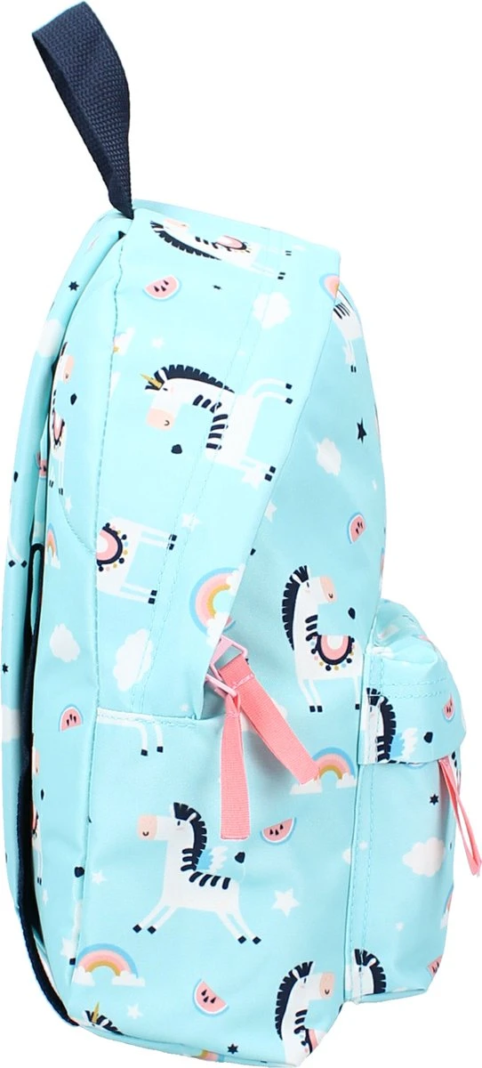 Als dit geen schattige rugtas is? Die wil je kindje vast overal mee naartoe nemen. Dit lichtblauwe rugzakje uit de Simple Things collectie is bedrukt me een leuke eenhoorn print. De rugzak heeft een handig voorvak met een rits met ruimte voor de kleinere spulletjes die mee moeten. Het grote hoofdvak heeft een handige dubbele rits en biedt ruimte voor bijvoorbeeld een broodtrommel of extra setje kleding. Handig als je kindje de rugtas mee naar school neemt. De rugzak is te dragen aan de lus aan de bovenkant of op de rug met de verstelbare schouderbanden.