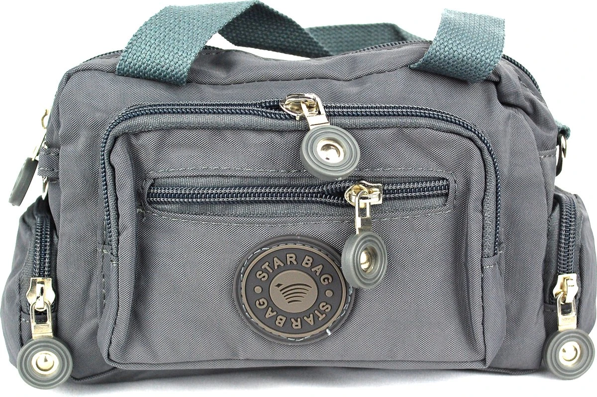 Reistasje van krinkel nylon met korte handvaten en afneembare lange hengsels. Met 8 vakken waarvan 1 groot in het midden met 2 extra vakjes, 5 vakjes aan de buitenzijde alle met ritssluiting. Zeer goede kwaliteit ritsen en mooi afgewerkt.Mooie KLEINE tas ( DUS LET GOED OP DE MAAT). Wat grotere modellen vindt u b.v. onder Starbag 0141 serie, KP-0101 serie of Starbag 1206 serie