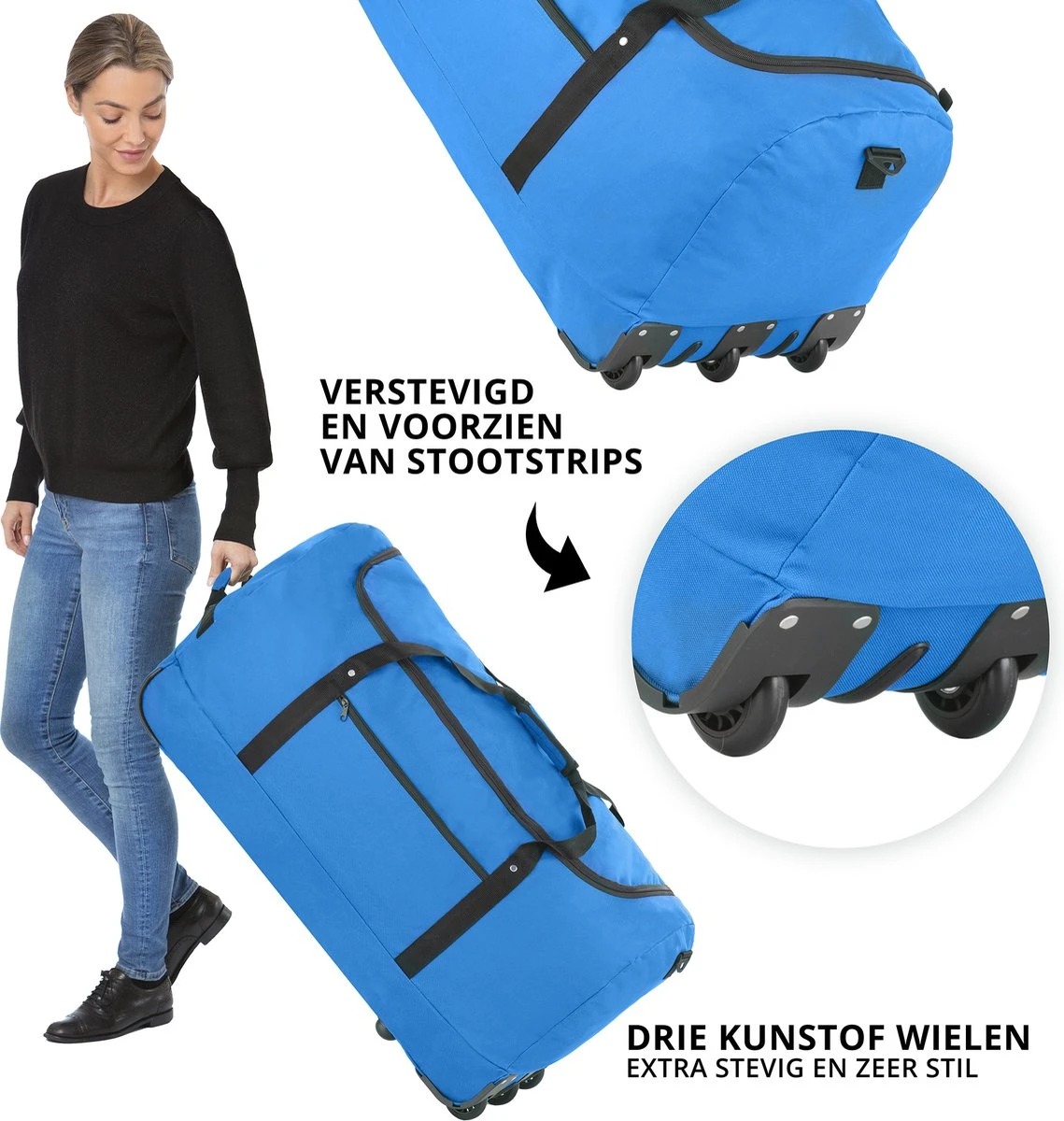 De TravelZ wieltas is makkelijk op te vouwen tot een klein pakketje en zeer ruim met 100 liter. De 3 geïntegreerde wielen zijn comfortabel in gebruik (let op dat wanneer deze leeg is, iets meer wiebelt), vervaardigd uit polyester, bevat een handvat aan de bovenzijde en is in 2022 vernieuwd op basis van consumentenfeedback. Er zijn rubberen beschermdoppen aangebracht op de onderzijde en ook extra beschermrubbers op de stof. De tas is op 3 punten verstevigd.