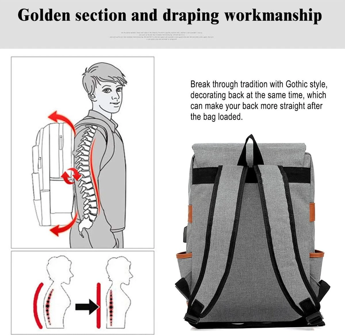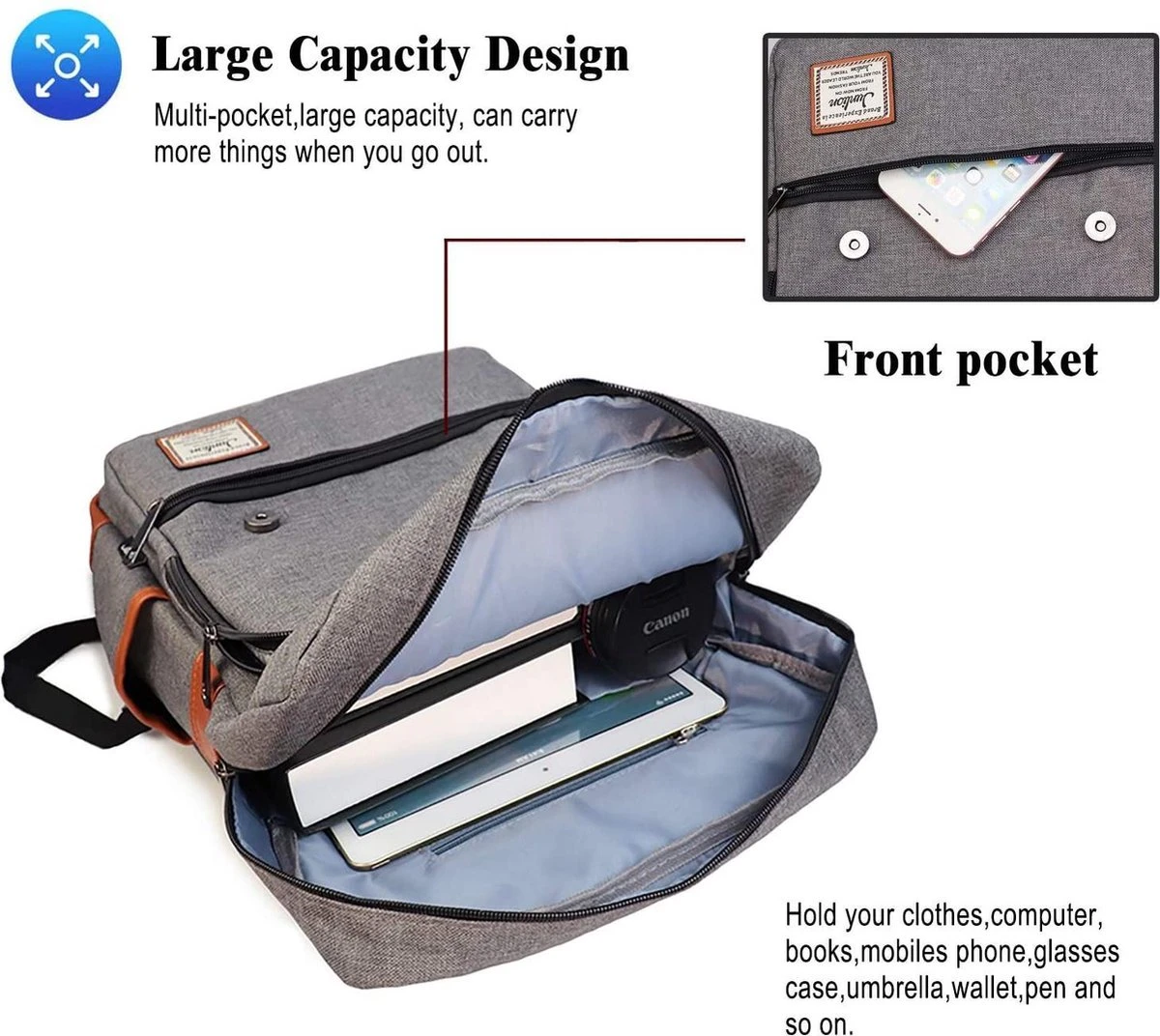 MEERDERE COMPARTIMENTEN: In totaal 6 compartimenten om uw eigendommen goed op te slaan. Groot hoofdvak aan de binnenkant is geweldig voor je boeken, kleding, laptop en andere dagelijkse dingen, en de extra zijvakken kunnen worden gebruikt om de fles en paraplu in op te bergen.