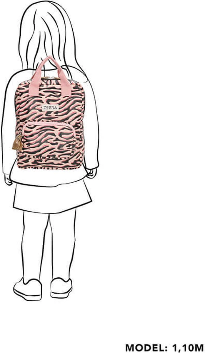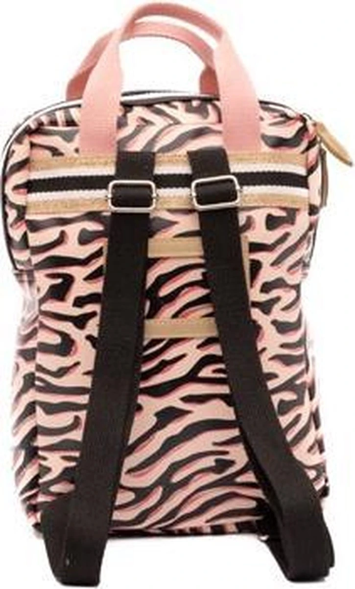Voor de little-ones! Het kleine formaat rugzak in Zebra print met subtiel glitter randje. Voorop zit een extra opbergvak die sluit met een rits en gouden glitter hartje. De gehele tas sluit met een stevige blokrits met dubbele sluiting in zwart-wit. De rugzak is te dragen dmv roze canvas hengsels en zwarte canvas schouderbanden. Binnenin bevinden zich 2 drinkbeker vakken en een vrolijke licht roze gestreepte voering. Het handige naamlabel zich achterop de tas.